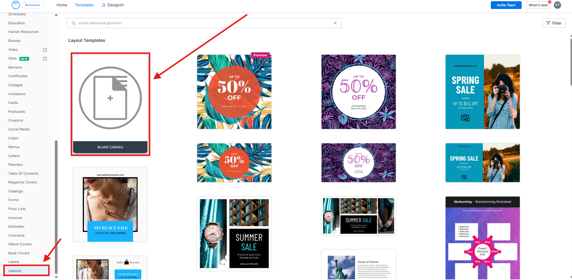 Möchten Sie volle kreative Kontrolle? Klicken Sie in der linken Seitenleiste der Vorlagenseite auf Layouts und wählen Sie die Leinwand leer-Kachel aus.