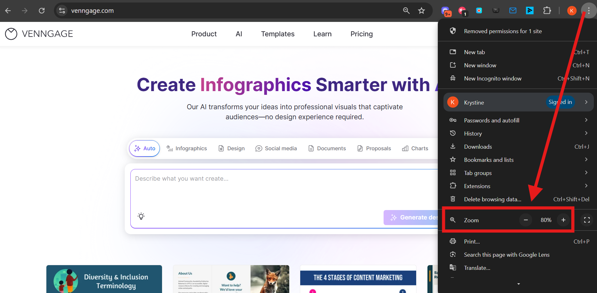💡 Für die beste Erfahrung im Venngage Editor stellen Sie den Browser-Zoom auf 100 % (Standard) ein.