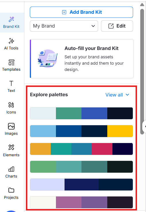 Klicken Sie auf Brand Kit in der linken Seitenleiste (oder drücken Sie Tab + Leertaste).