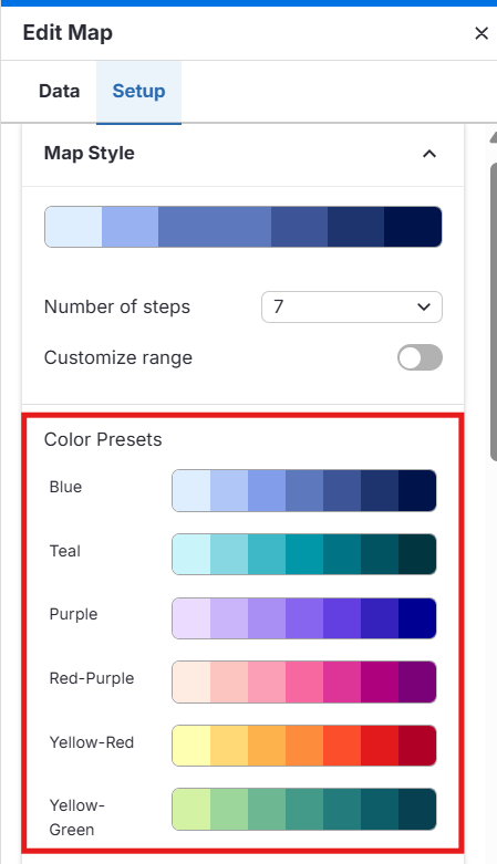⚠️ Hinweis: Um die Anzahl der Stufen zu ändern, muss der Kartentyp (Map Type) auf Choropleth (Choroplethenkarte) eingestellt sein.