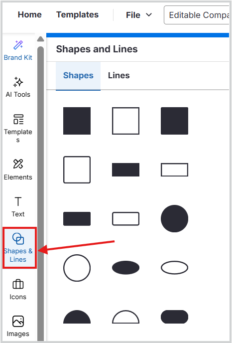 Wenn Sie eine andere Form hinzufügen möchten, gehen Sie zum Bereich Shapes im linken Seitenpanel und wählen Sie die gewünschte Form aus.