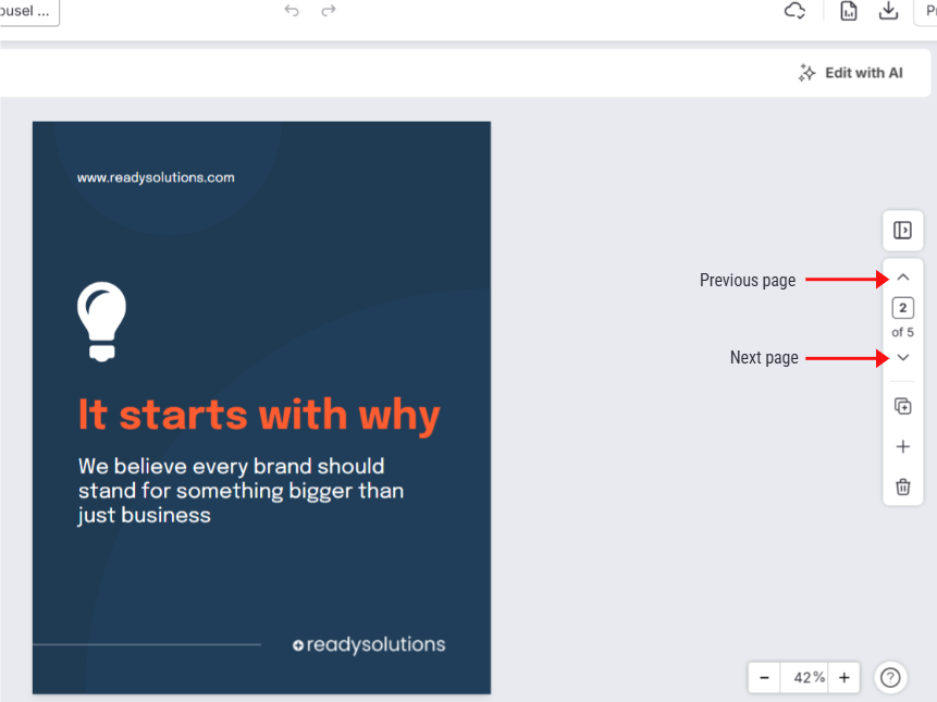 You can move between pages in your design using the Page Manager toolbar, located on the right-hand side of the Venngage Editor.