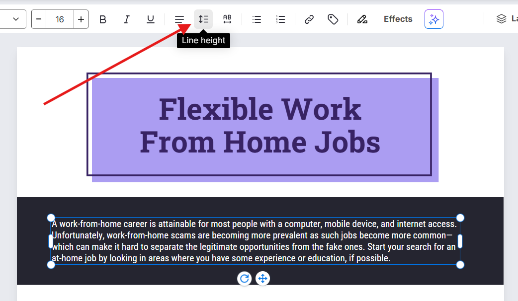 Use the Line Spacing (Line Height) slider or input box to increase or decrease the distance between lines of text.