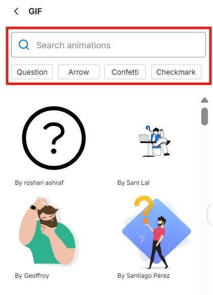 Use the search bar to find a specific GIF by typing related keywords (e.g., happy, celebration, computer), or browse by category such as Question, Arrow, Confetti, or Checkmark. Add the GIF to your design