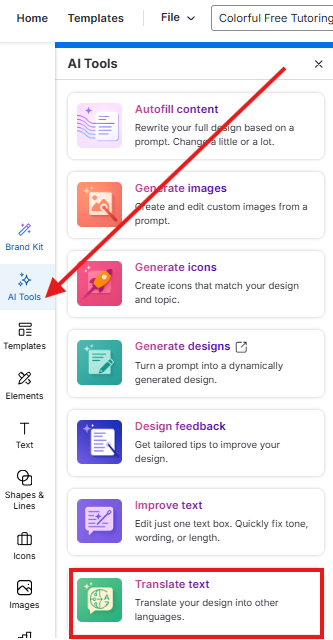 The AI Translate feature lets you to instantly translate your designs into various languages. This makes it easy to create multilingual content without starting from scratch.