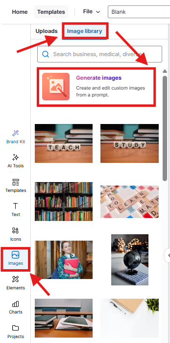 In the left toolbar, click Images > Image Library, then click Generate images.