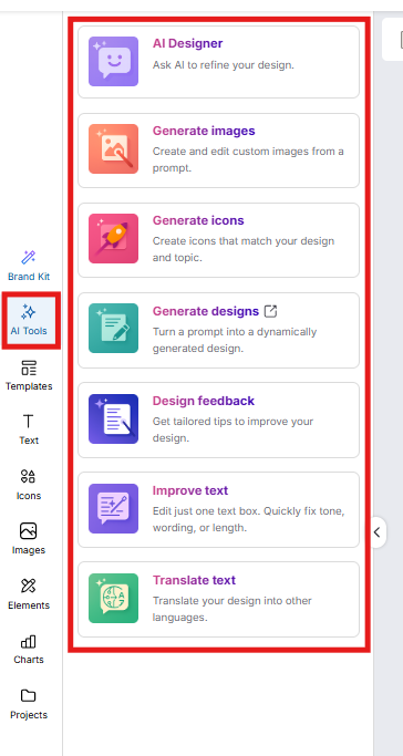 You can access all of these AI features directly from the AI Tools Panel in the editor. The panel provides a quick overview of every available AI tool, so you don’t need to search through different menus. It’s the fastest way to launch tools like Image Generator, Icon Generator, Improve Text, Translate, and more.