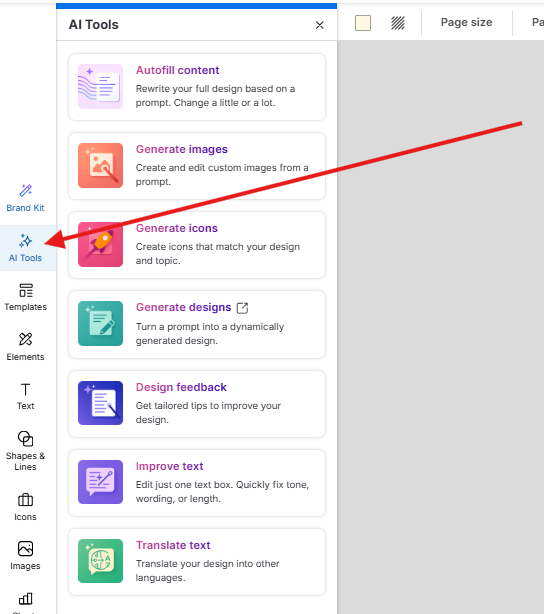 👉 You can also find it in the AI Tools Panel, along with the Icon Generator, Image Generator and other AI-powered features. This is the quickest way to explore all AI tools in one place.
