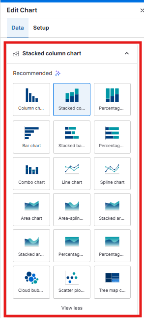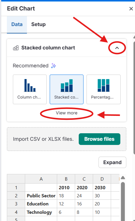 In the Edit Chart panel on the right-hand side, open the Data tab, click the chart type dropdown, and then click View More.
