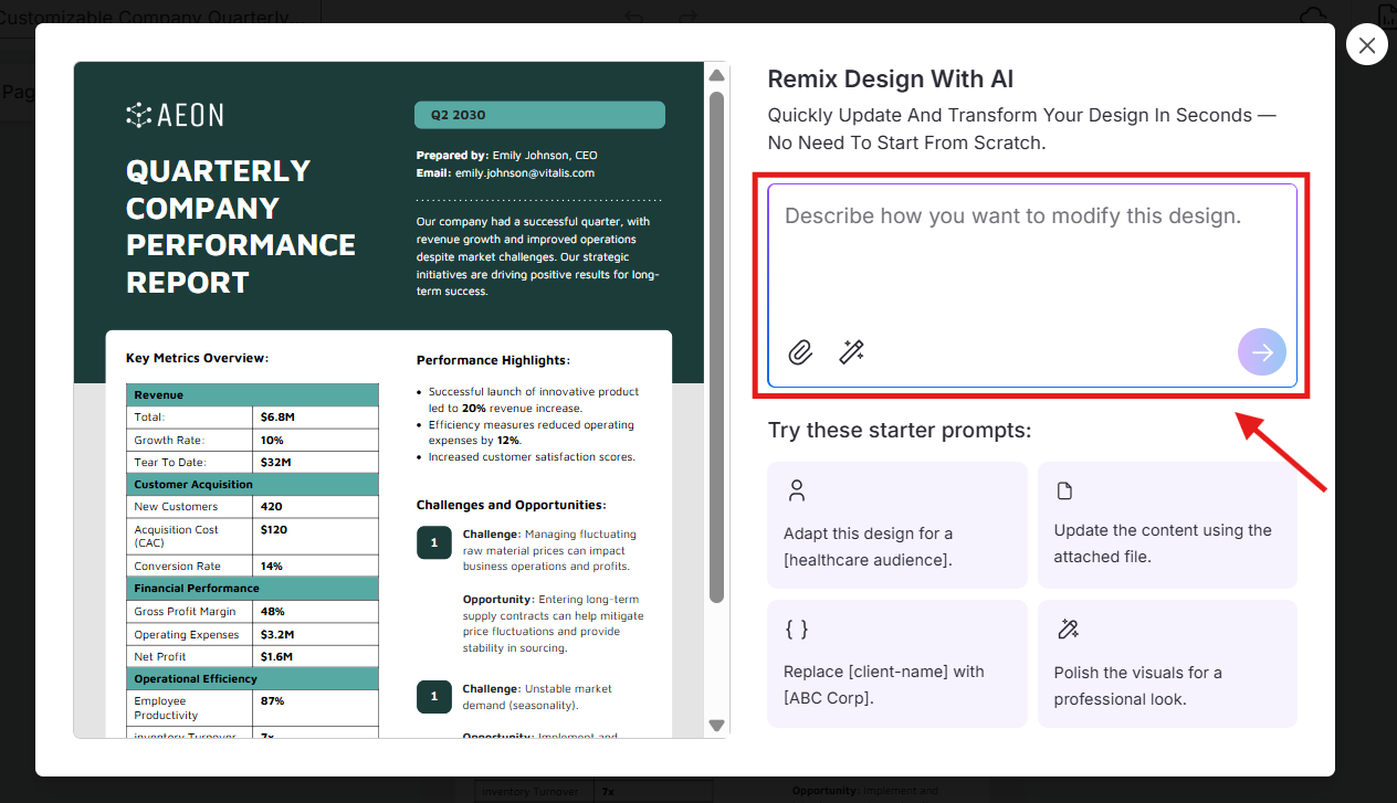 Need to update a recurring report, presentation, or template without rebuilding it from scratch? Remix with AI lets you copy an existing design and instantly refresh it with new text and data — while keeping your layout and style intact.