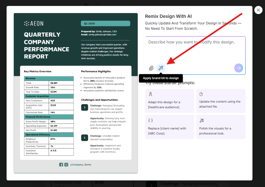 Apply your brand kit (optional): If you want to keep your colors, fonts, and logo consistent, click Apply Brand Kit to Design in the remix modal. AI will automatically apply your brand styles while updating the content. (This option is only available for Business users.)