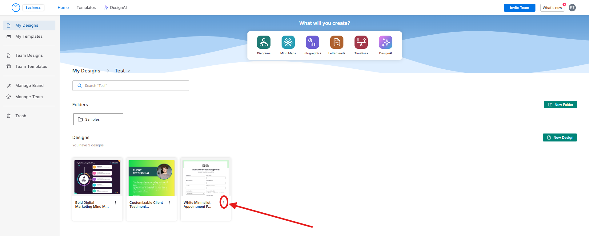 A confirmation message will appear: “Your design has been moved.” The design will now appear in its new Folder.