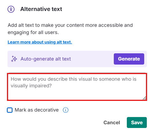 Generar alt text automáticamente — Haz clic en Generate para que Venngage cree una descripción automática. Puedes editar o mejorar el texto generado antes de guardar.