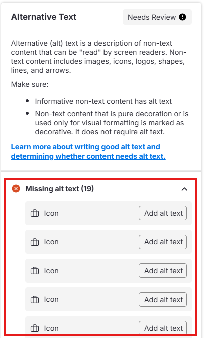 El verificador resaltará todos los elementos no textuales y señalará los alt text faltantes.