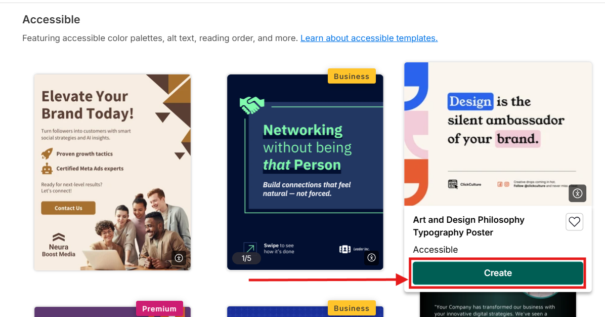 Busque "diseños accesibles" o haga clic en la categoría "Accesible" en "Buscar por" en la barra lateral izquierda de la página Plantillas .