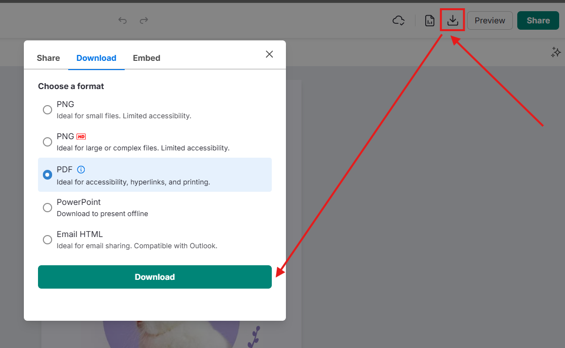 3. Haz clic en Descargar y elige PDF como formato de archivo para garantizar la compatibilidad con herramientas de accesibilidad.