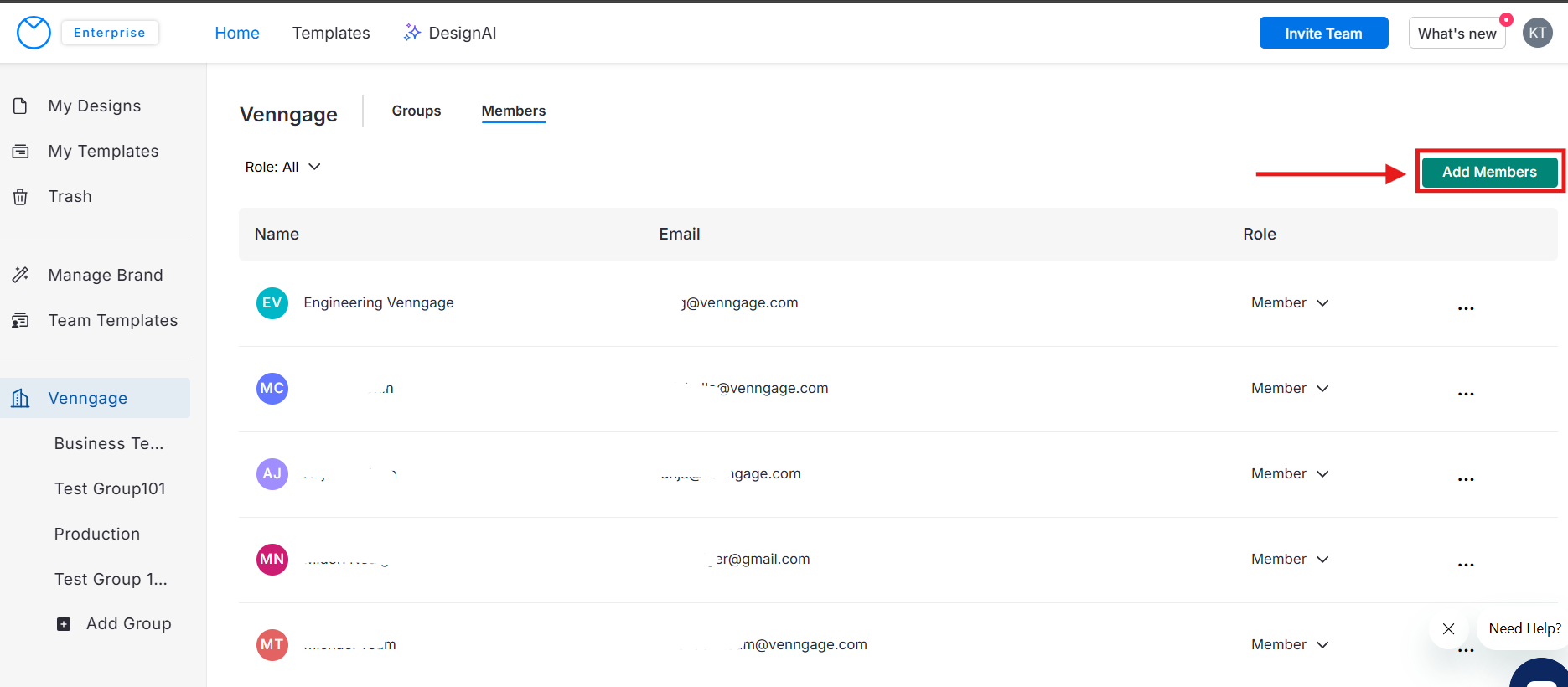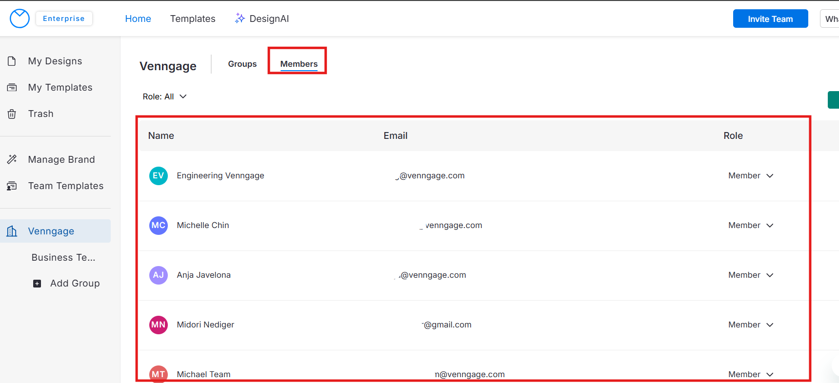 Puedes ver todos los Miembros y Grupos directamente desde tu página de Inicio de Venngage.