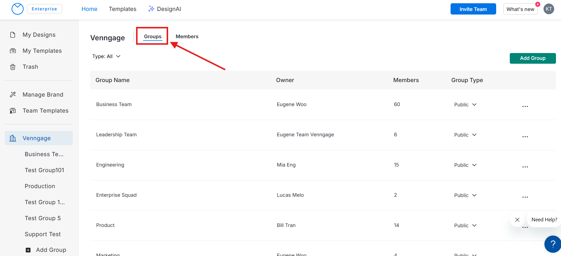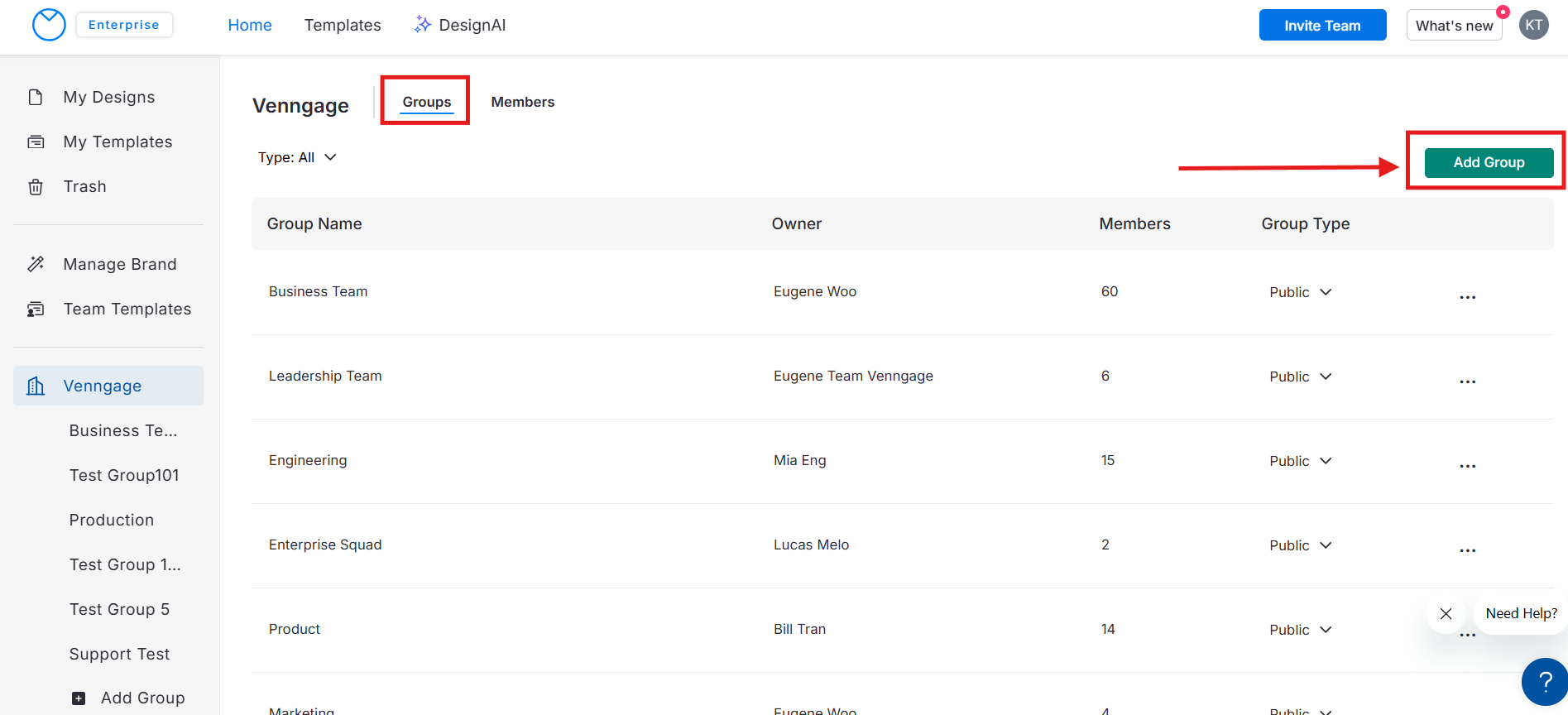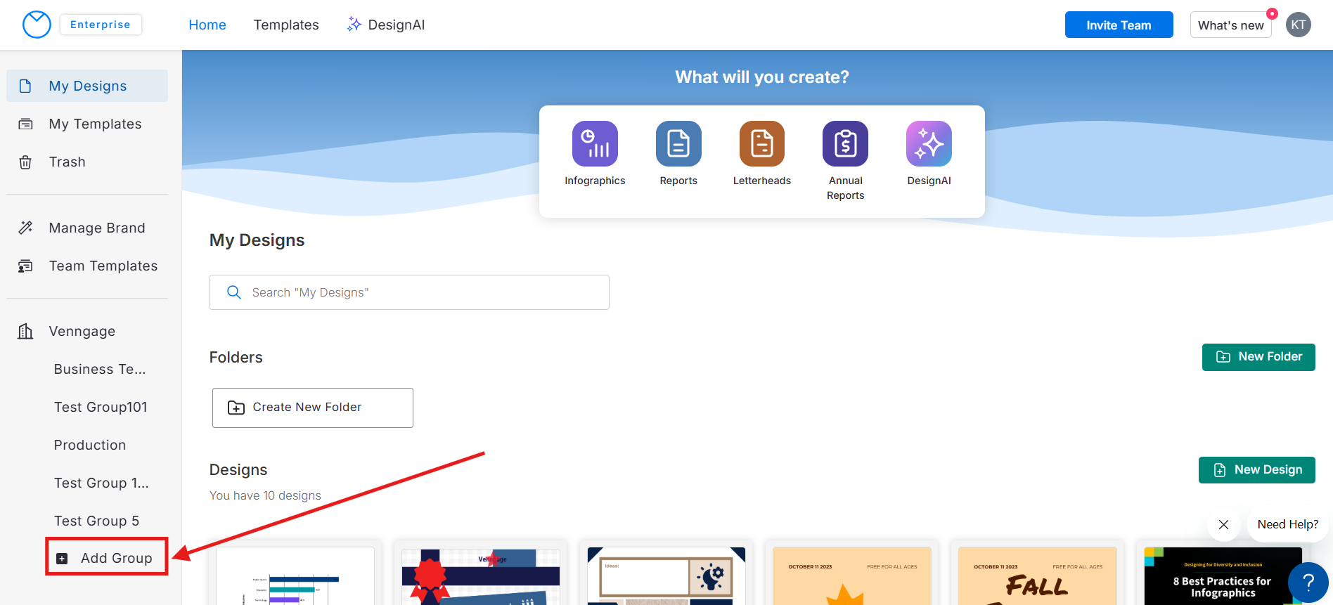 Los miembros con un plan Enterprise pueden crear Grupos, compartir diseños dentro de ellos e invitar a otros Miembros a colaborar fácilmente.