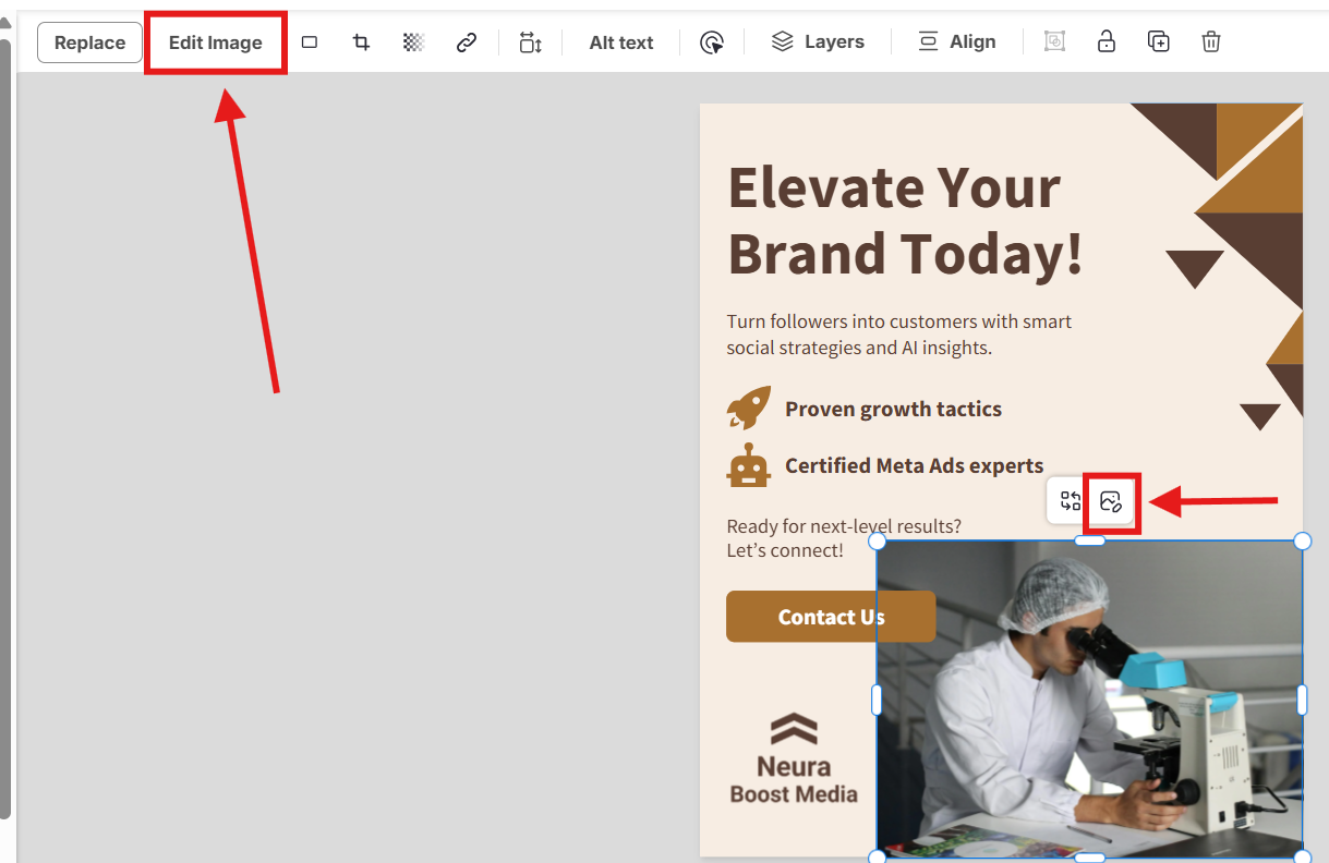 Abre el panel Editar imagen haciendo doble clic en la imagen o haciendo clic en el ícono Editar imagen que aparece sobre ella.