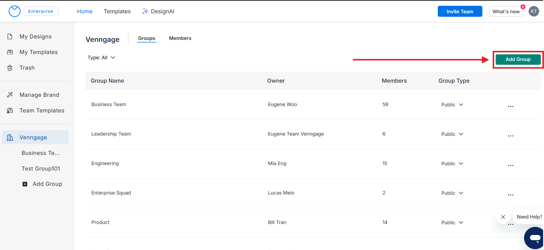 Encontrarás tus Grupos en la barra lateral izquierda de la página de inicio de Venngage — son los Grupos que has creado o a los que te has unido.
