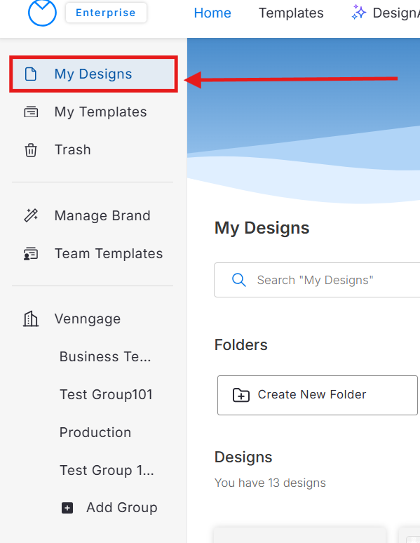 Ve a Mis Diseños desde la página de inicio o la barra lateral.