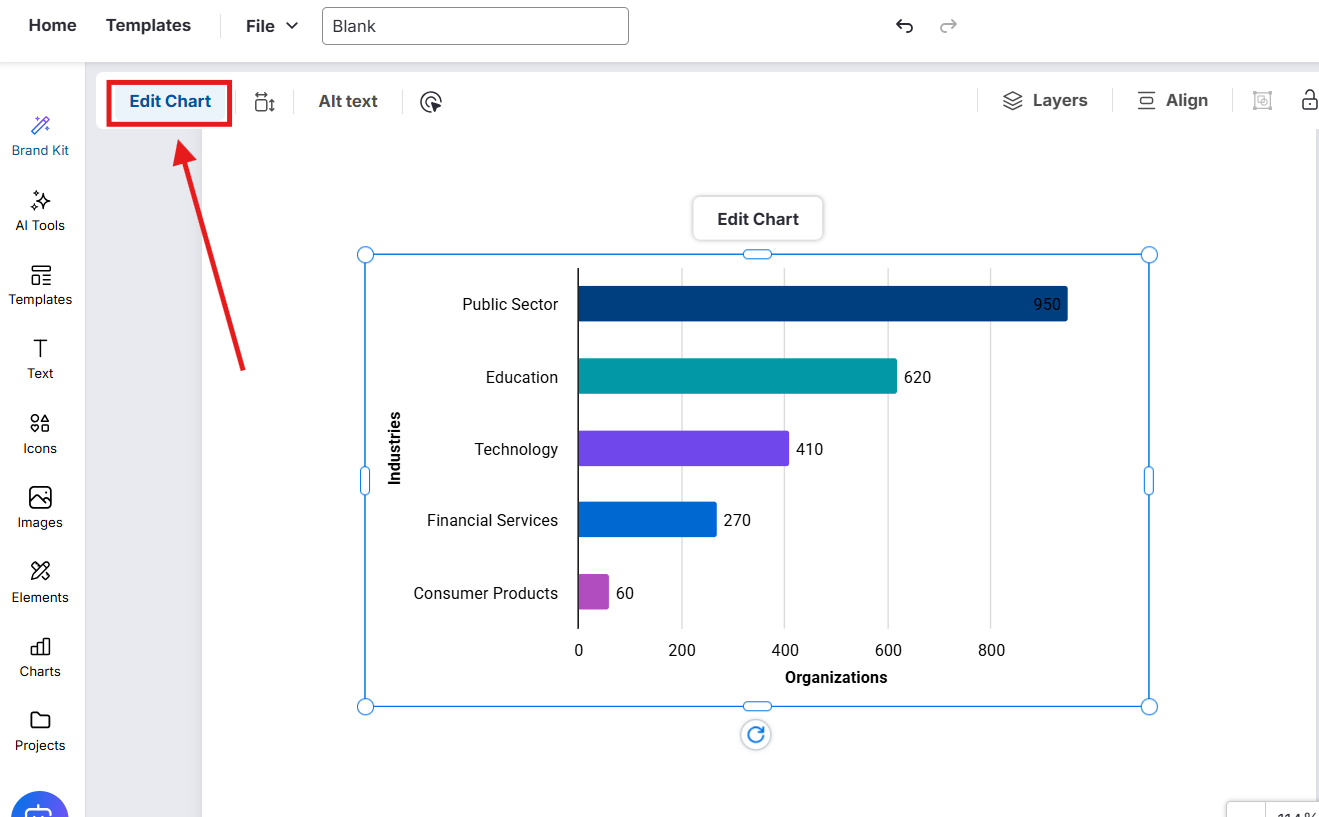 Haz doble clic en tu gráfico en el lienzo para abrir el panel de edición del gráfico en el lado derecho del editor, o haz clic en el botón Editar gráfico en la barra de herramientas superior.