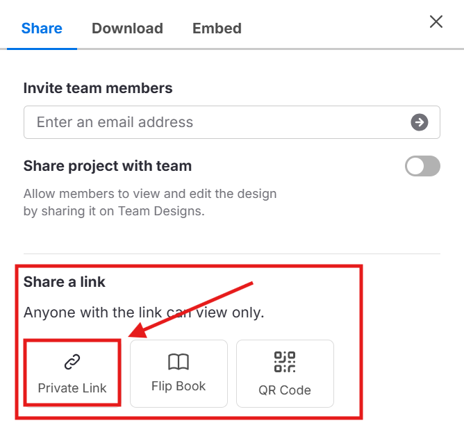 ¿Quieres compartir tu diseño sin necesidad de descargarlo? Si estás en un plan Premium, Business o Enterprise, puedes generar un enlace privado — perfecto para enviar tu diseño directamente por correo electrónico o chat
