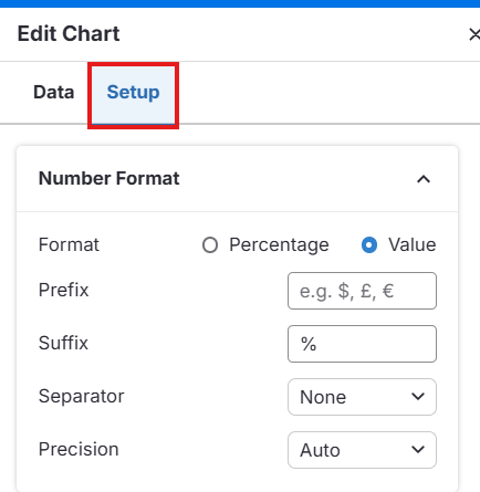 También puedes hacer clic en el ícono Editar Gráfico en la parte superior del gráfico o simplemente hacer doble clic en el gráfico para abrir el editor.En la pestaña Configuración, haz clic en Formato de Número.