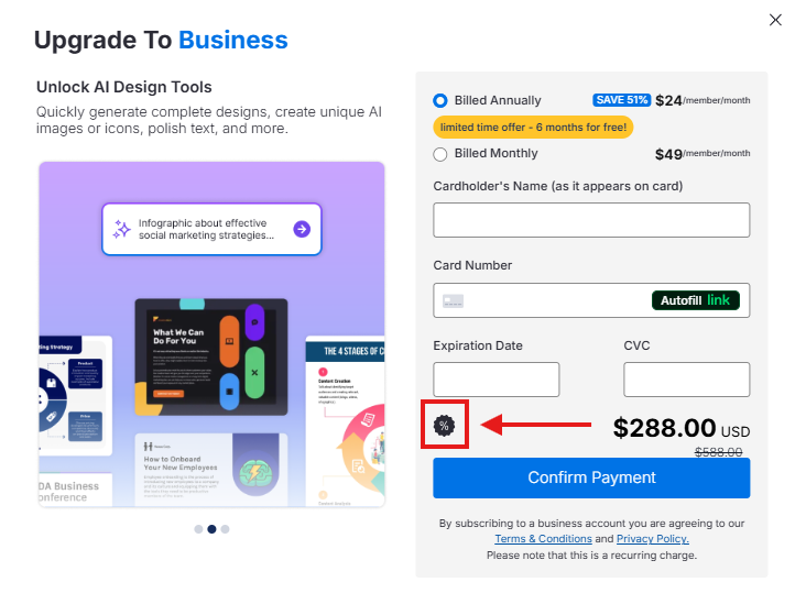💡 Consejo: Los cupones se aplican de inmediato, por lo que verás el precio actualizado de tu suscripción antes de confirmar la actualización.