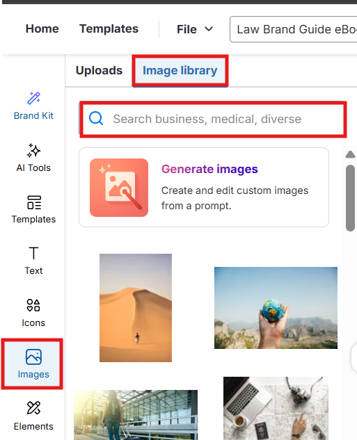 En la pestaña Biblioteca de imágenes, introduce un término de búsqueda; cuanto más específico sea, más precisos serán los resultados.