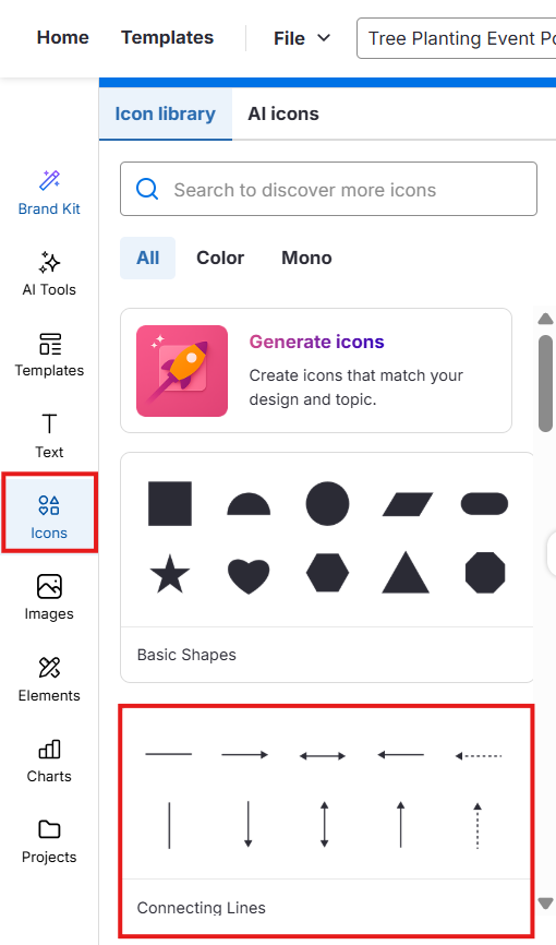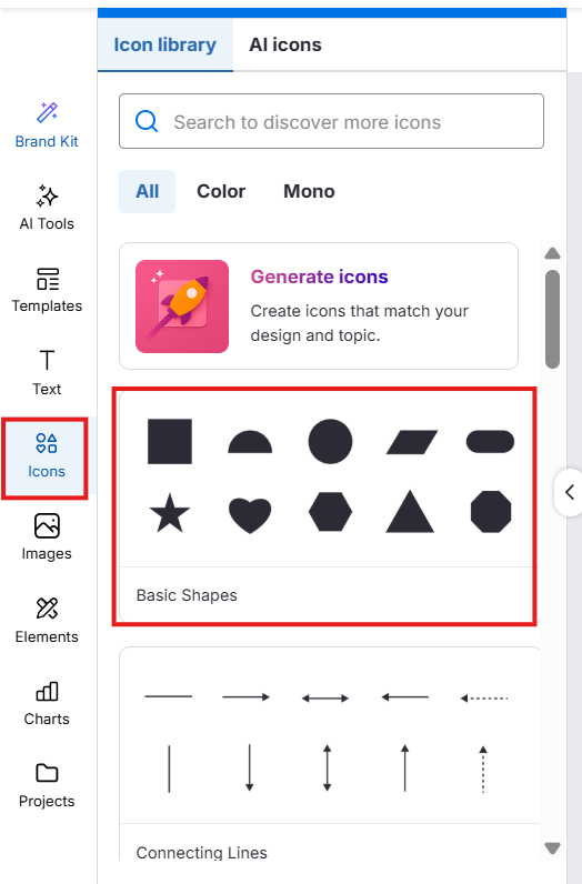 Para agregar una forma, escribe “Formas” en la barra de búsqueda o abre la categoría Formas y Líneas en la sección de Íconos.