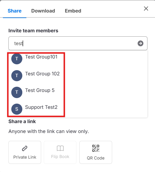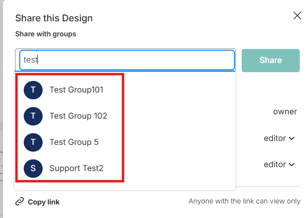 En el modal Share this Design, escribe el nombre de uno o más Grupos.