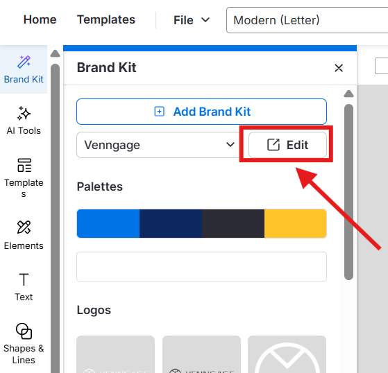 O, desde el Editor, abre la barra lateral izquierda, haz clic en Mi Kit de Marca y luego selecciona Editar. Esto abrirá la página de Gestionar Marca en una nueva ventana.