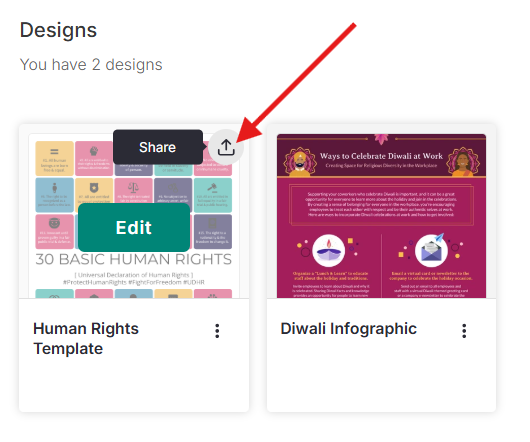 Pasa el cursor sobre el diseño que deseas compartir y haz clic en Compartir.