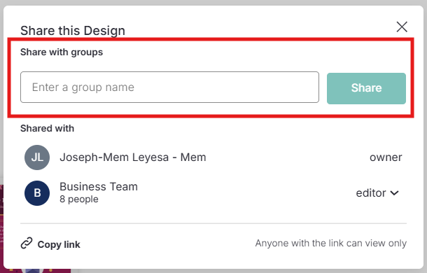 En la ventana Compartir este diseño, escribe el nombre del Grupo. Los Grupos que hayas creado o a los que te hayas unido aparecerán automáticamente.