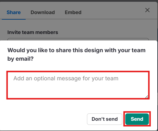 Después de seleccionar un Grupo, verás la opción: “¿Te gustaría compartir este diseño con tu equipo por correo electrónico?”