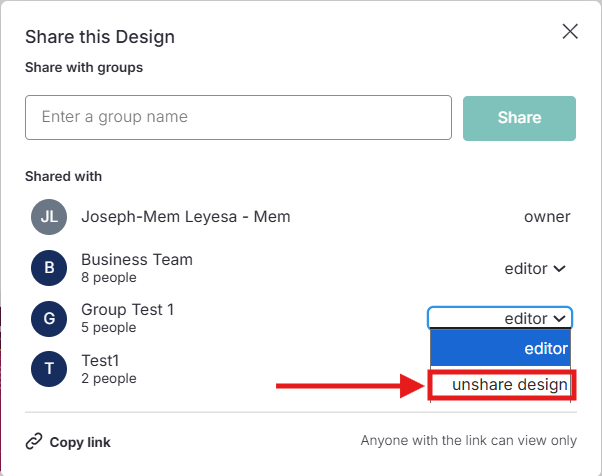 Junto al nombre del Grupo, haz clic en la flecha hacia abajo junto a Editor y selecciona Dejar de compartir diseño.