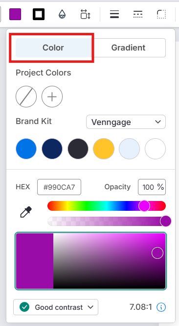 Elige un nuevo color sólido usando el selector de color, o selecciona uno desde tu Brand Kit o los Colores del proyecto.