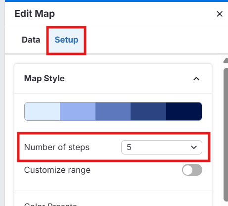 ⚠️ Nota: Para cambiar el número de pasos, el Tipo de mapa (Map Type) debe estar configurado como Choropleth (mapa coroplético).