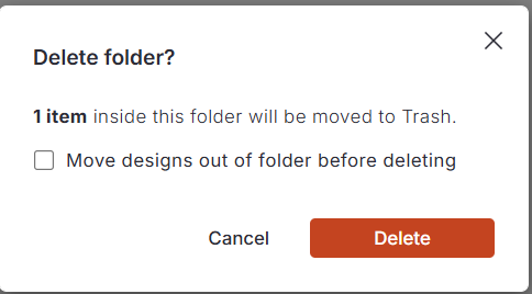 Puedes eliminar cualquier carpeta que hayas creado en Mis Diseños, Diseños del Equipo o en un Grupo. Al eliminarla, tendrás la opción de mover los diseños de vuelta a Mis Diseños o eliminarlos permanentemente.