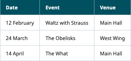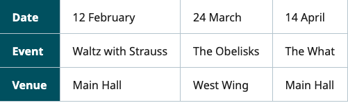 Esta tabla ofrece la misma información que la tabla anterior, con una columna de encabezado en lugar de una fila de encabezado. Nuevamente, esto permitirá que un lector de pantalla identifique dónde se encuentra la información en la tabla; por ejemplo, leyendo la celda inferior derecha en la última columna como "Lugar (Fila 3), Sala principal".
