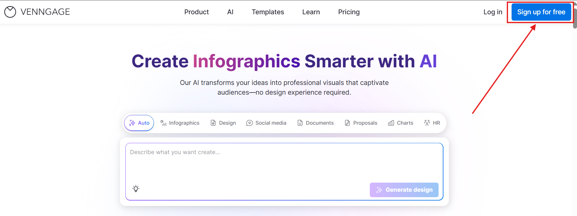 Rendez-vous sur Venngage.com et cliquez sur S’inscrire gratuitement.