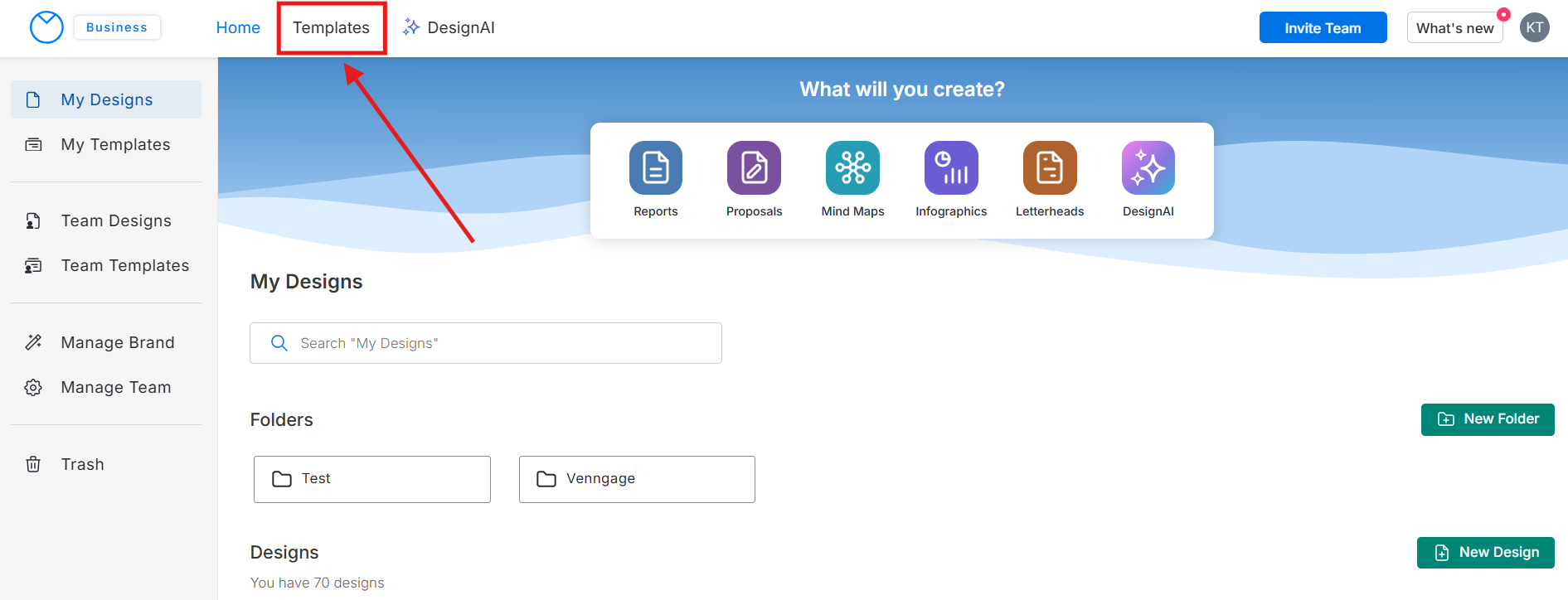 Depuis la page d’accueil de Venngage, cliquez sur l’onglet Modèles en haut (à côté de “Accueil”). Vous serez redirigé vers la page des modèles, où vous pouvez explorer une grande variété de designs organisés par catégorie.
