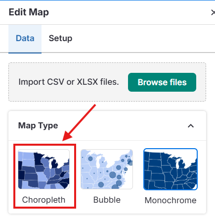 Par défaut, les cartes sont définies en Choropleth. Vous pouvez ajuster le style dans le panneau Edit Chart (Modifier le graphique) :