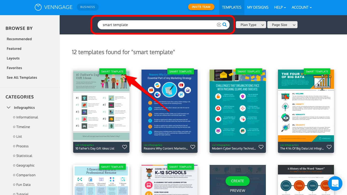 Recherchez des modèles pour l'infographie ou le modèle que vous souhaitez créer. Les modèles intelligents portent la balise « Smart ». En savoir plus sur les modèles intelligents.