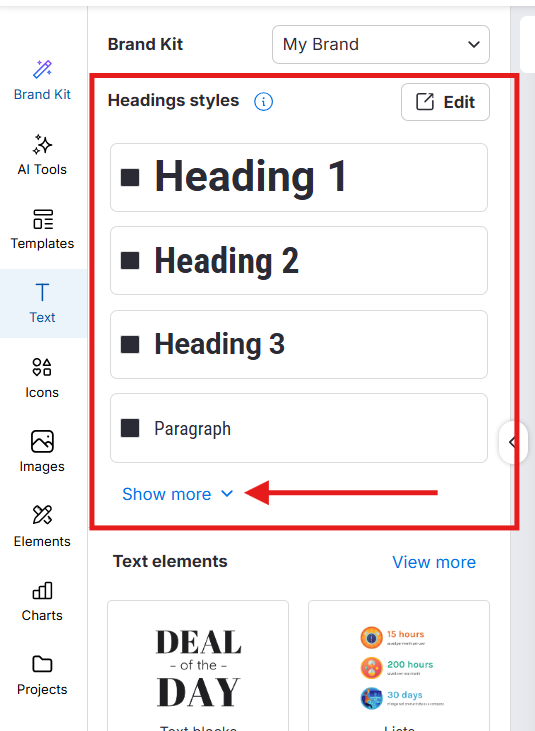 2. Choisissez un style de texte à ajouter à votre canevas ou cliquez sur Afficher plus pour voir des options supplémentaires.