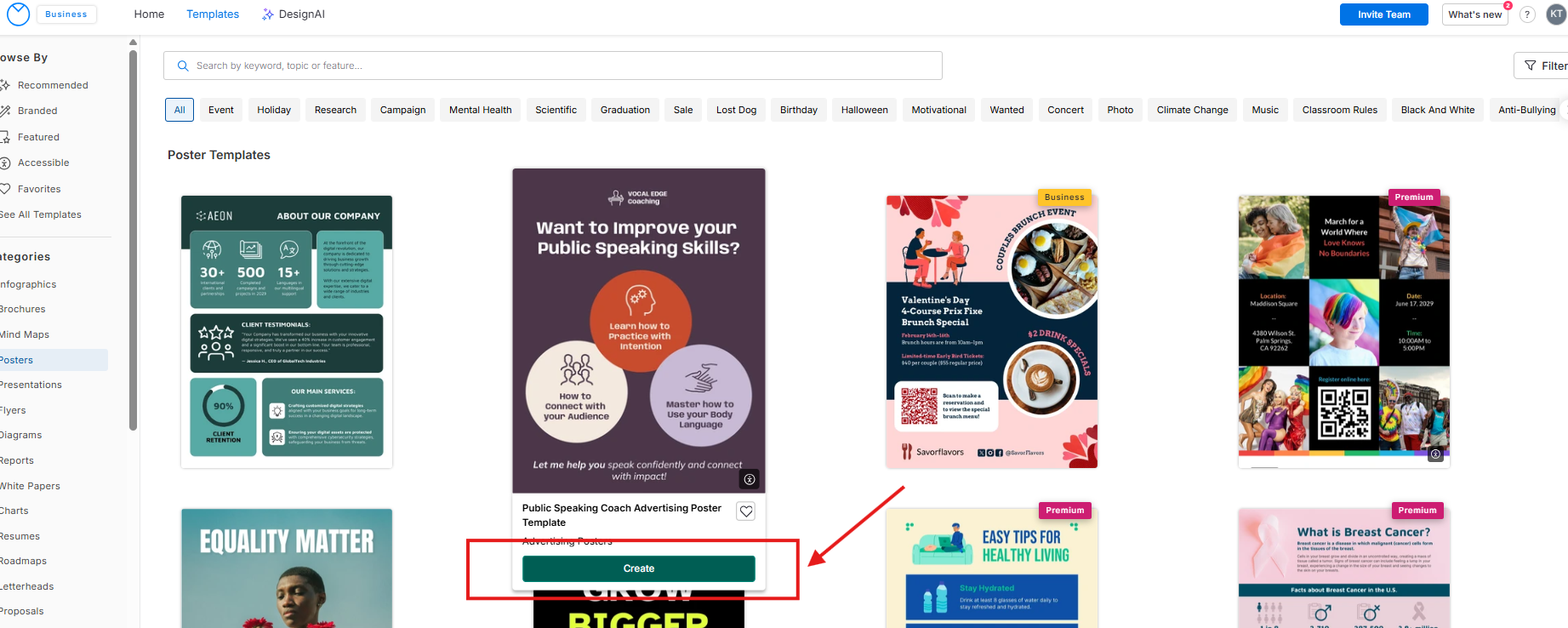 Lorsque vous parcourez les modèles, survolez une vignette d’aperçu et cliquez sur Créer pour ouvrir le modèle dans l’Éditeur et commencer à le personnaliser.