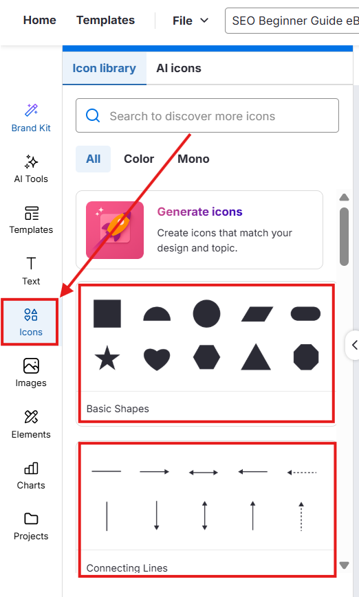 Icônes : Sélectionnez une icône dans votre design, puis changez sa couleur à l’aide du sélecteur de couleurs dans la barre d’outils supérieure.