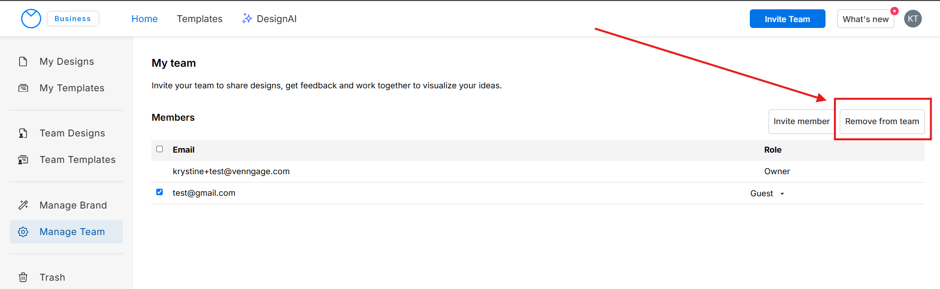 Depuis votre page d’accueil Venngage, cliquez sur Manage Team dans la barre latérale gauche.