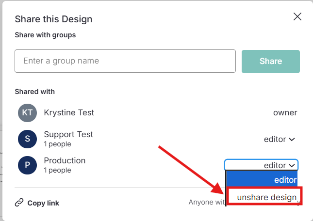 Pour retirer un groupe, cliquez sur le menu déroulant et sélectionnez Ne plus partager le design.